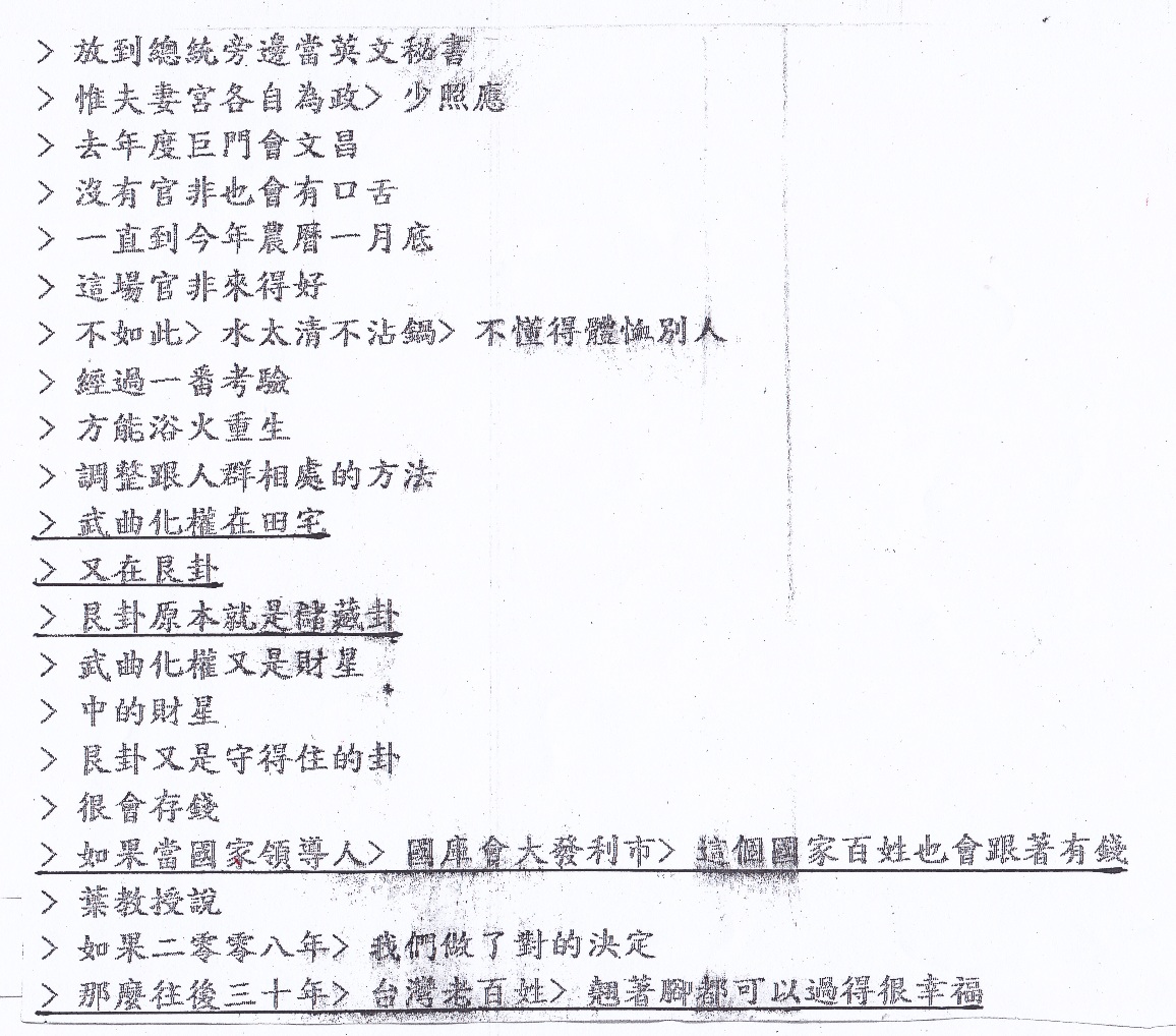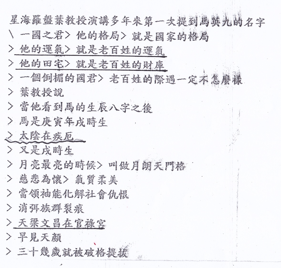 於2008年總統大選時 應該很多人接到星海 羅盤葉 教授的E-mail 內容上他說 :〔一 國之 君的格局,就是國家的格局,他的運氣就是老百姓的運氣;他的田宅就是老百姓的財庫;一個倒霉的領導人,老百姓的際遇也一定跟著倒霉。〕星海羅盤他講的都沒有錯,事實也就是如此,所以在2008年9月20日在基隆市立文化中心提出不同的論點,當場演講會的主持人是基隆益世廣播電臺主持人張麗英記者,當初有到演講會場的觀眾應該猶言在耳。