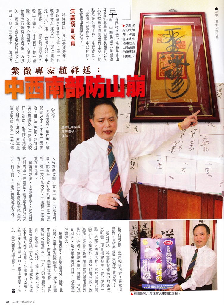早在國道3號七堵路段走山前,中華民國天星紫微斗數研究學會理事長趙祥廷就以紫微命盤預測出有山崩,地點是在台灣北部、中西南部。「北部已經發生,中部的話,我看廬山也很危險。」