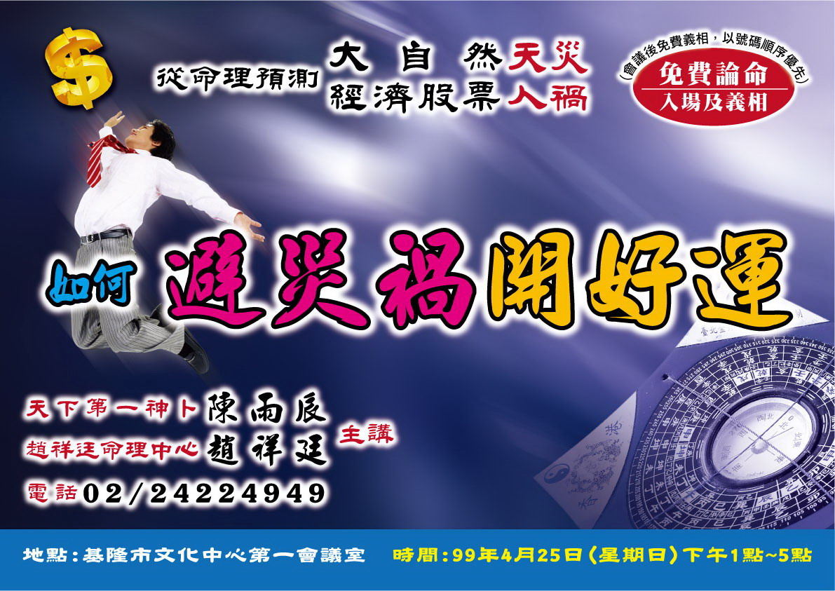 昨天,國曆100年1月13日還是屬於農曆99年(庚寅年),中山高基隆段又再次發生山崩走山災害, 趙祥廷 老師的預言再次成真。