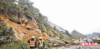 昨清晨五時五十分許,民眾林慶隆(五十一歲)載妻子行駛國道一號,當時他行駛在外側車道,怎料行經四點六公里處,突見右方約三層樓高的邊坡整片坍塌,巨石、岩塊掩過護欄衝向路面,他急忙將方向盤往左猛打,閃進內側車道,但右前車頭還是被落石砸中,右前輪當場爆胎。