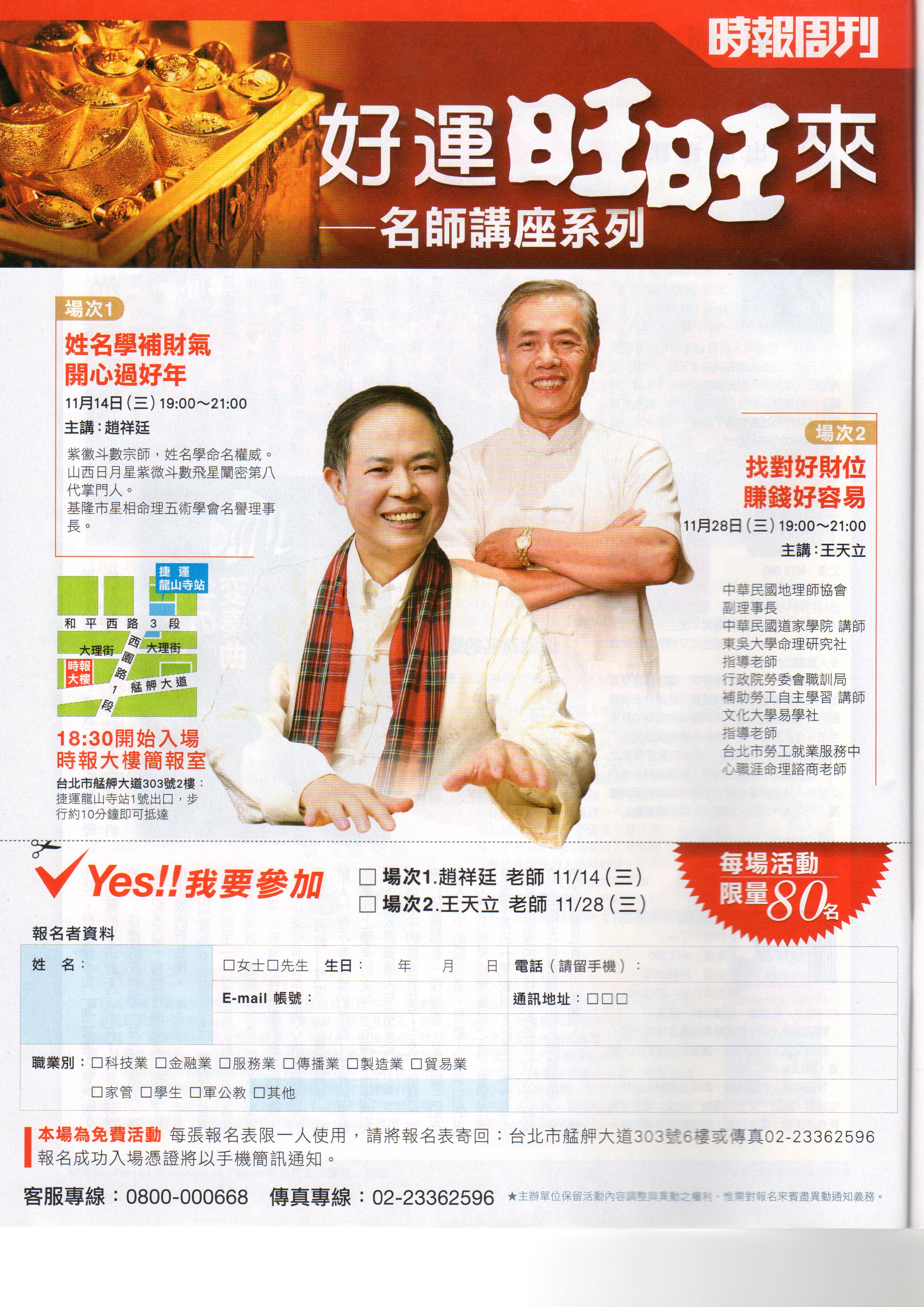 姓名學對人的一生重要嗎?這是一個困擾許多人的大問題。為了解決大家心中的疑惑,讓大家更有信心的去應付詭譎多變的時局,讓社會大眾更擁有自信的年年過好年,《時報週刊》主辦的好運旺旺來---名師大講堂,特地邀請紫微斗數宗師、姓名學權威來為大家解惑。
